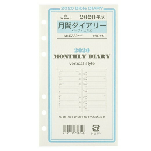ASHFORD アシュフォード 2020年1月始まり(2019年12月始まり) システム手帳リフィル バイブル(6穴) 月間ダイアリー バーティカル式 BIBLE アクセサリー リフィル 予定表 2020 バインダー ブランド 名入れ スケジュール帳 手帳のタイムキー